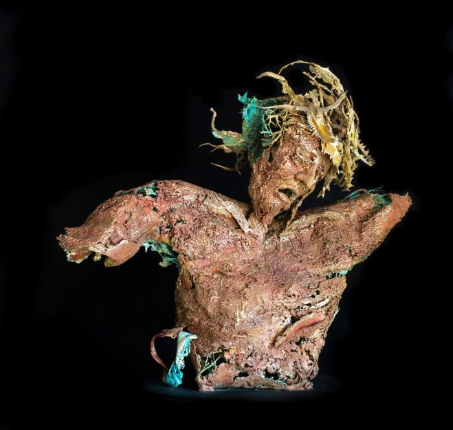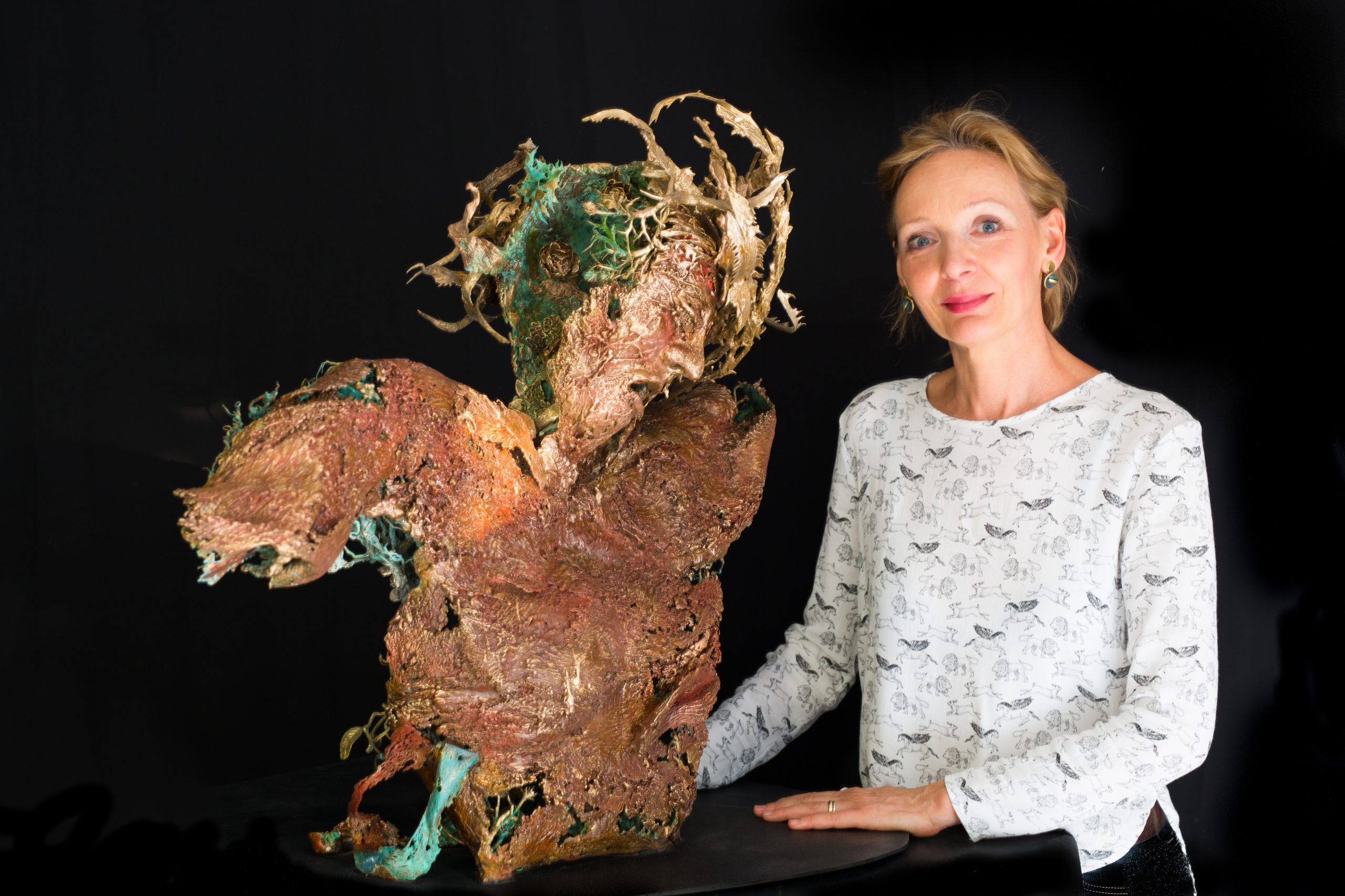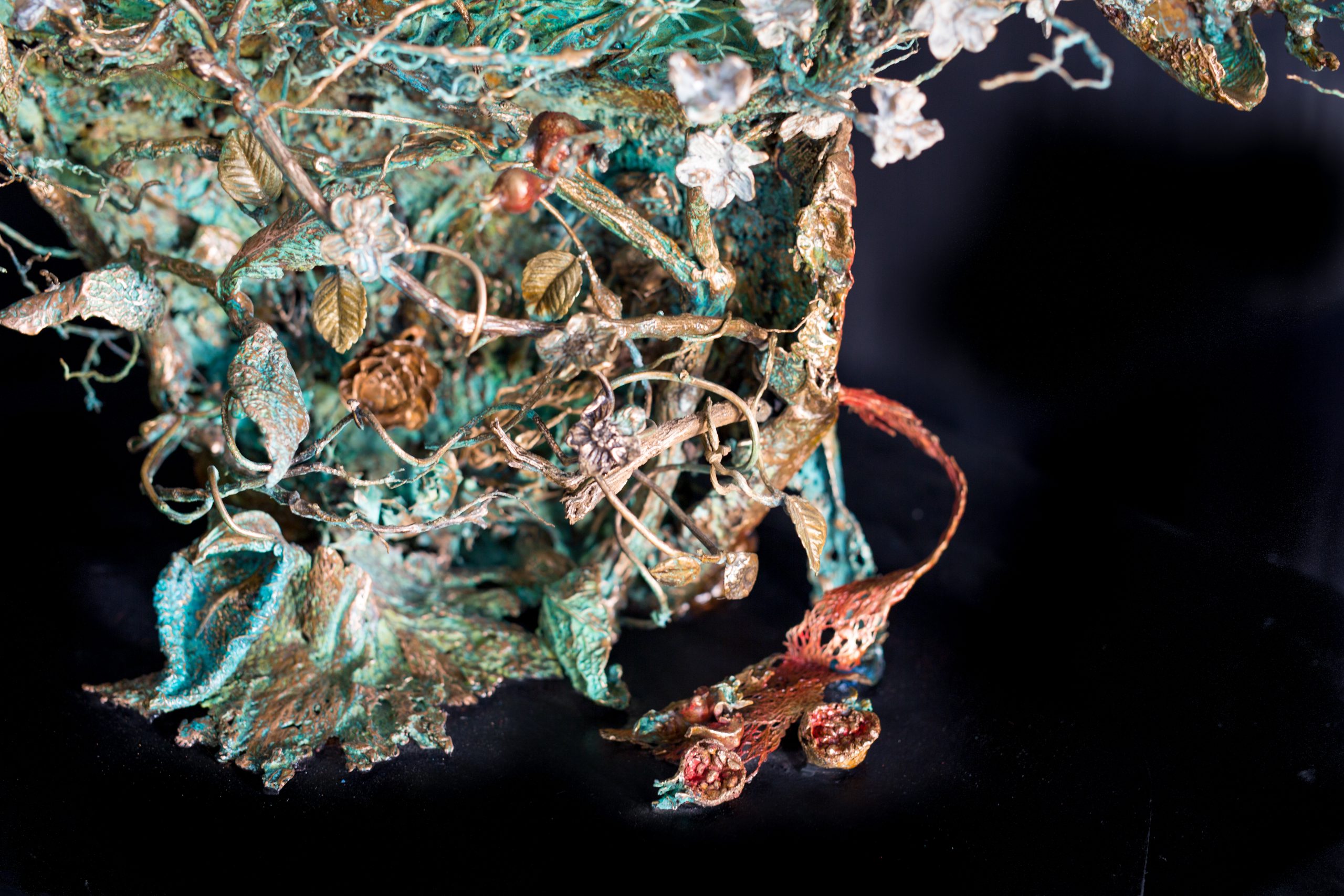 Materiały: brąz (odlew traconego wosku), patyna ogniowa w odcieniach czerwieni i zieleni, polerowanie na złoto, stalowa podstawa 6 mm