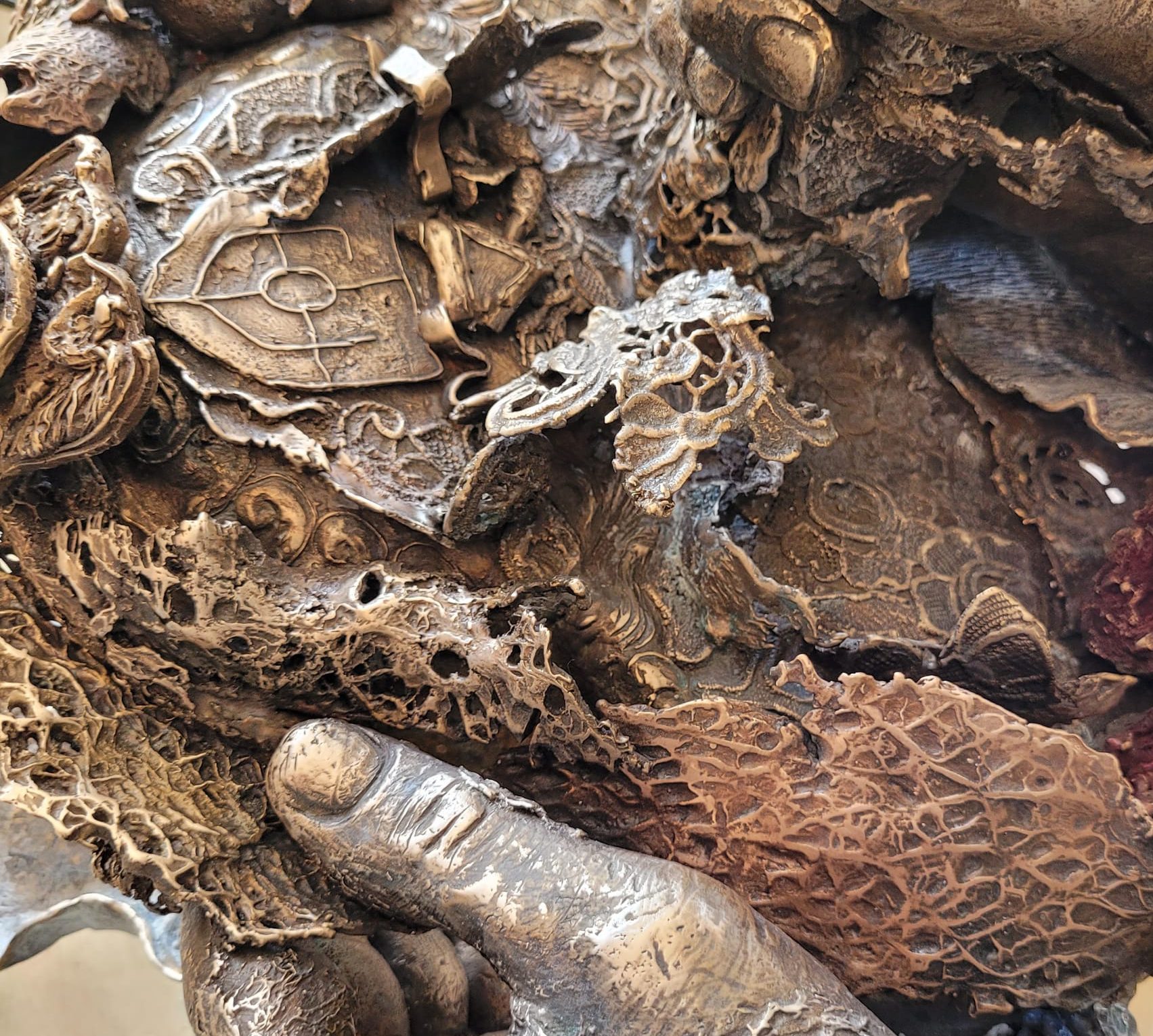 Materiały: Rzeźba w brązie, technika wosku traconego, in vacuum, patyna ogniowa, emalia na miedź i szkliwo 835 st. C, agat geoda, elementy złocone.