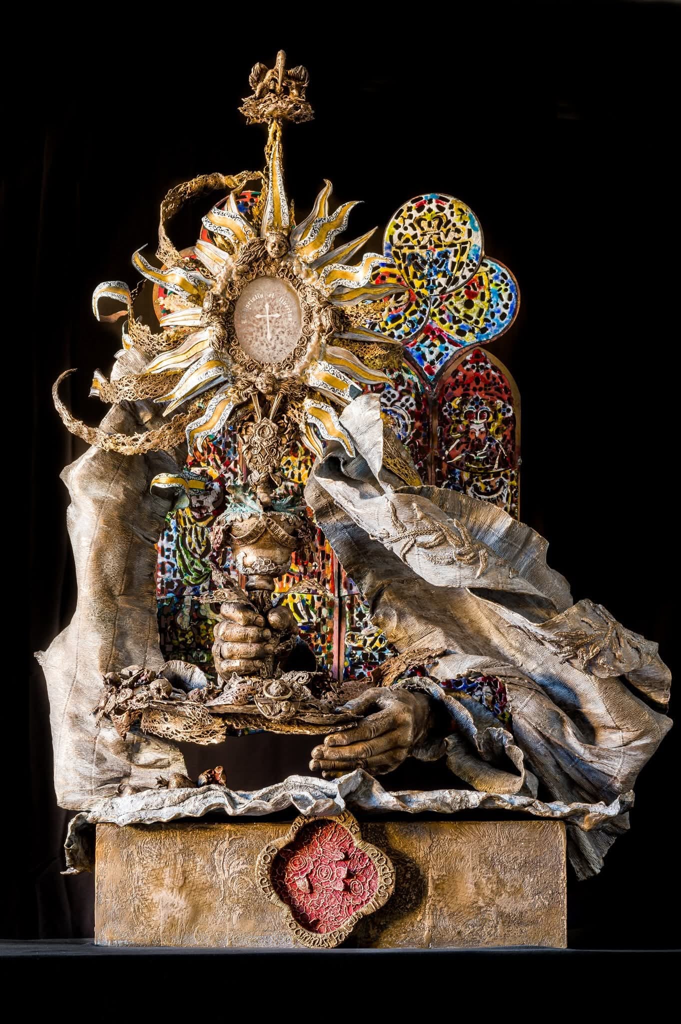 Symbolicznie przedstawione witraże pozwalają natychmiastowo rozpoznać wnętrze wrocławskiej Katedry. Nie są one ze szkła. Tutaj są wykonane w miedzi i poddane precyzyjnemu szkliwieniu, podobnie jak monstrancja.. Przez puste wolne przestrzenie przechodzi światło. Monstrancja przedstawiona w rzeźbie unoszona jest nad podstawa będąca fragmentem ołtarza, który jest jednocześnie miejscem osadzenia relikwii.